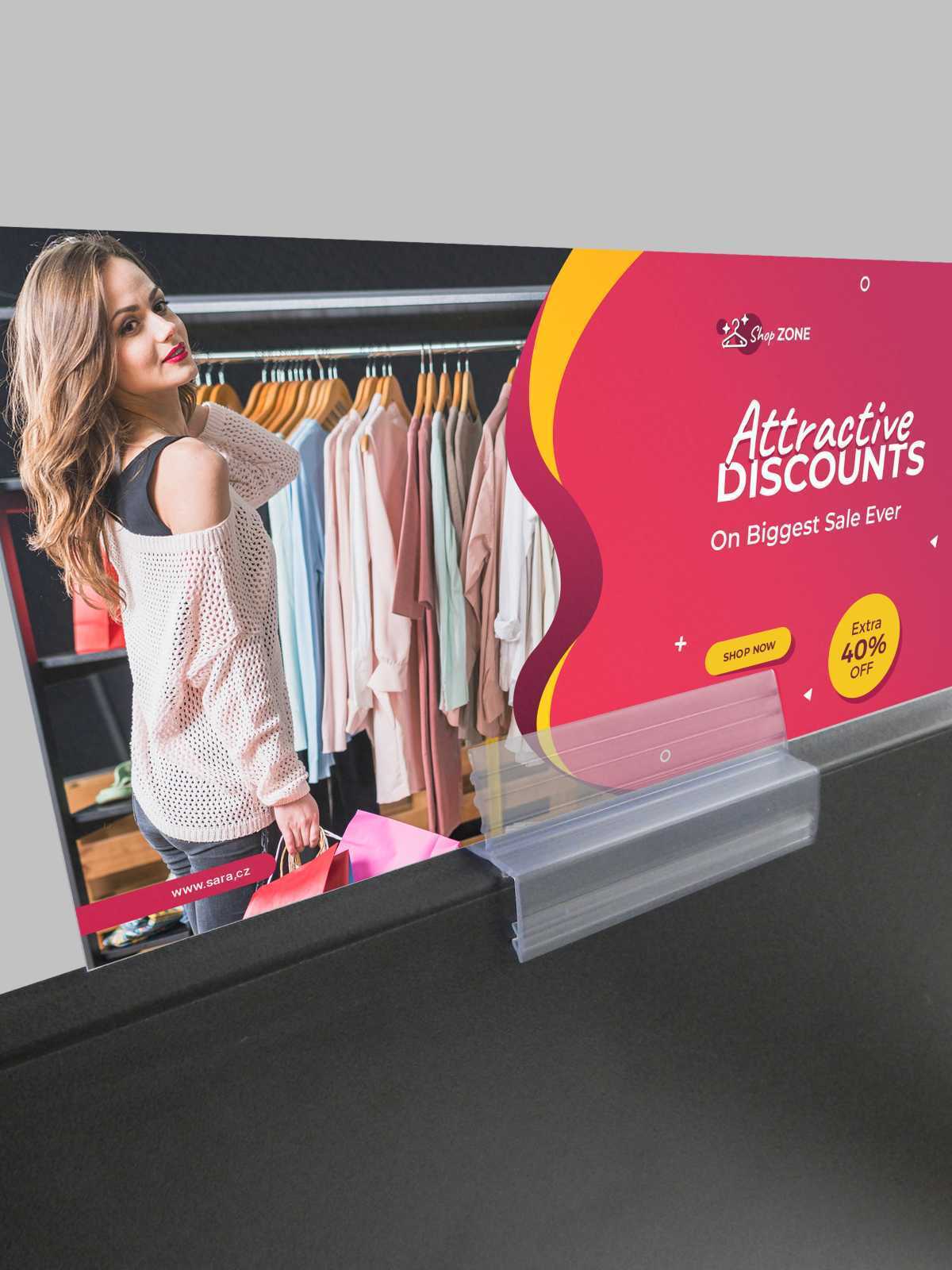 • Snadná instalace: Montáž je rychlá a bezproblémová – stačí lištu nacvaknout na hranu desky a vložit reklamní materiál do horního úchopu.